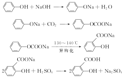 將酚與50%氫氧化鈉按1:1.02(mol)配比加入反應(yīng)器中進(jìn)行反應(yīng)脫水,控制游離堿≤1%,減壓脫水后,再加酚作溶劑共沸脫水。然后將酚鈉在酚中通入干燥的二氧化碳?xì)怏w,進(jìn)行羧化反應(yīng)3h后,第二次通入二氧化碳2h,再減壓回收酚,即羧化完畢。再向上述水楊酸鈉溶液中,加入水溶解成50%的溶液,在攪拌下加入7%-8%的酸化至ph值1-2,然后冷卻過濾,真空干燥,即得水楊酸粗品,再將粗品在減壓下升華,可得含量為99%的成品水楊酸,收率50%-70%。(2)中壓法 仍以酚為原料,先制成酚鈉,在中壓下用二氧化碳進(jìn)行羧基化,生成碳酸酚酯,然后加壓進(jìn)行分子重排,生成水楊酸鈉,再經(jīng)酸化后處理制得水楊酸。